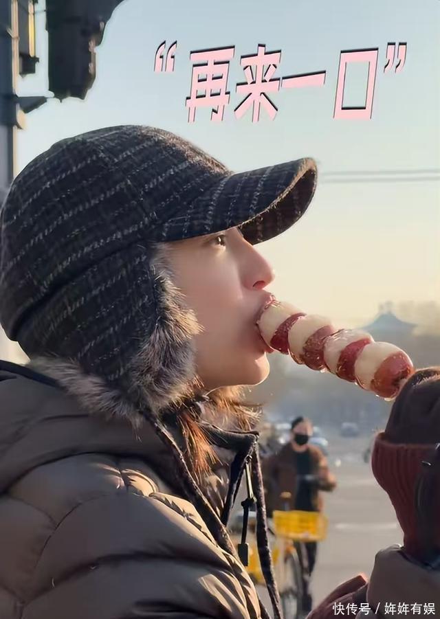 店家问他好不好吃,她很认真的回答:“好好吃”。 就连等红绿灯的间隙,手中又拿了一串冰糖葫芦,边骑边吃。