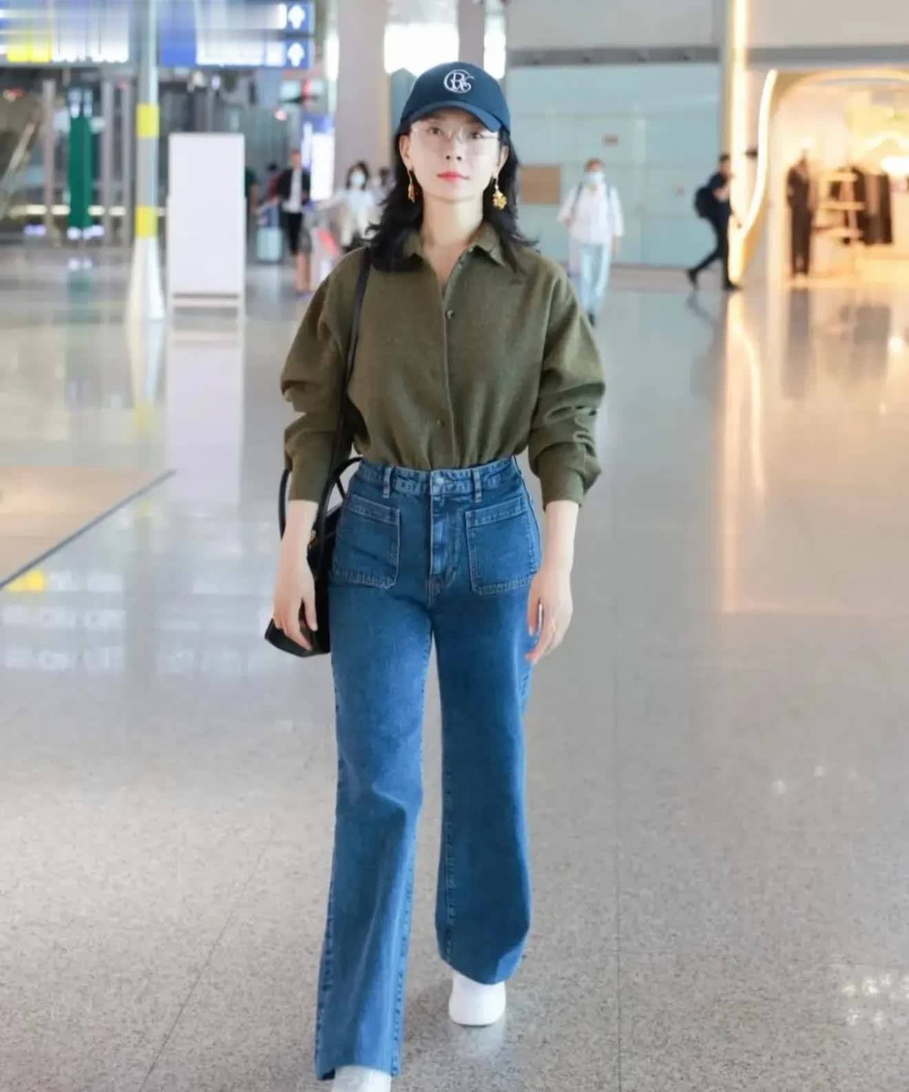 陈数下半身搭配的蓝色高腰牛仔裤,与头戴的棒球帽颜色相呼应,牛仔蓝清新宜人,且牛仔裤包容性强,让她的腿型看上去更加修长。